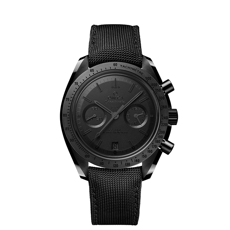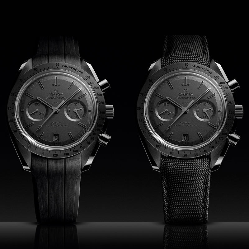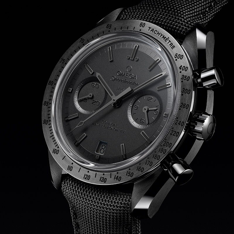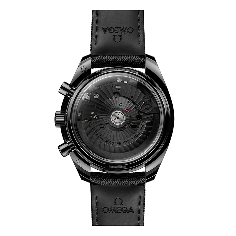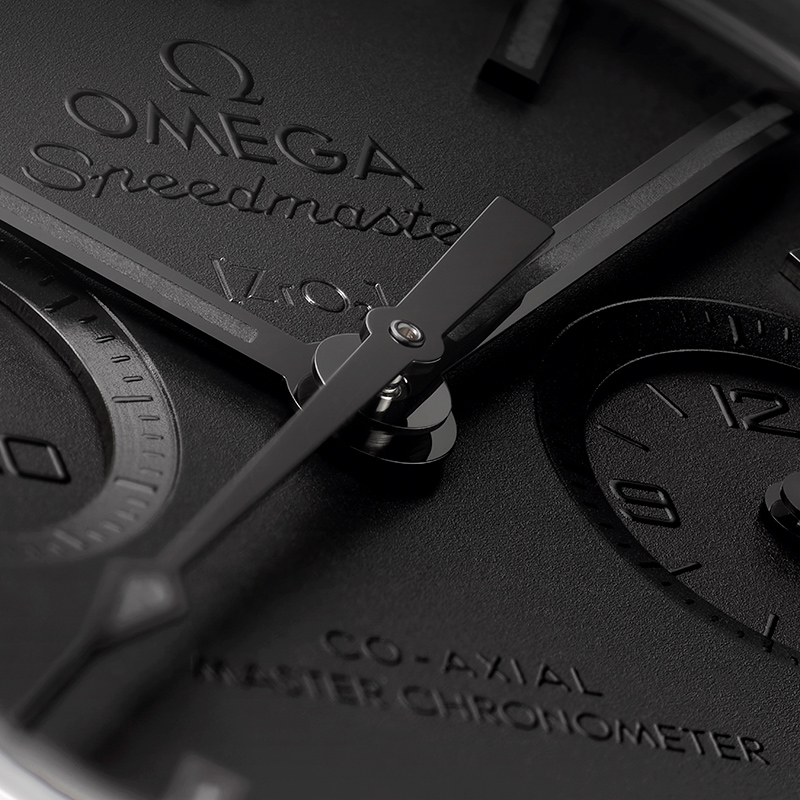 Die neue Speedmaster Dark Side of the Moon „Black Black“ mit Co-Axial Master Chronometer 9900 besitzt ein 44,25 mm großes Gehäuse aus polierter, schwarzer Keramik. Die gebürstete Lünette ist ebenfalls aus schwarzer Keramik gefertigt und verfügt über eine lasergravierte, mit schwarzem „Grand Feu“-Email gefüllte Tachymeterskala. Das Keramikzifferblatt unter dem vorderen Saphirglas ist mit einem Laser sandgestrahlt. Alle Zeiger und abgeschrägten Indizes sind geschwärzt und mit schwarzem Super-LumiNova (grün leuchtend) gefüllt.