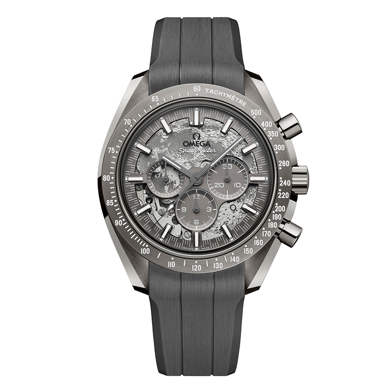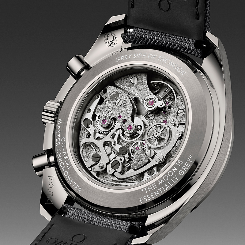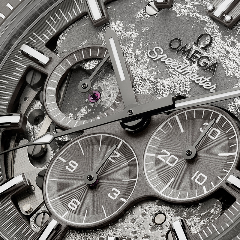 Die Speedmaster Grey Side of the Moon ist ein Modell zu Ehren der Apollo-8-Crew, die als erste Menschen die Rückseite des Mondes sahen. Inspiriert von Jim Lovells Aussage, „der Mond ist im Wesentlichen grau“, zeigt die Uhr eine lasergravierte Mondoberfläche, sichtbar durch das Werk. Vorder- und Rückseite des Mondes sind durch das skelettierte Zifferblatt und den Gehäuseboden erlebbar – eine einzigartige Mondlandschaft, angetrieben vom Co-Axial Master Chronometer Kaliber 3869.